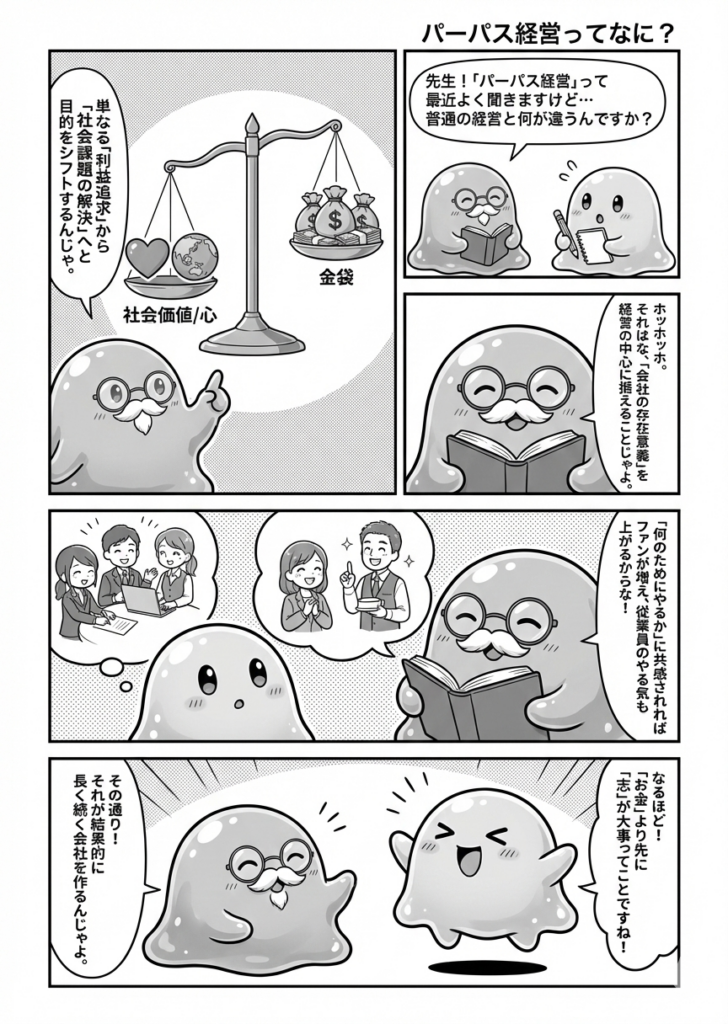 「自分たちの会社は、何のために社会に存在するのか?」 この「存在意義(パーパス)」を明確にし、それをすべての事業活動の軸にする経営スタイルのことです。